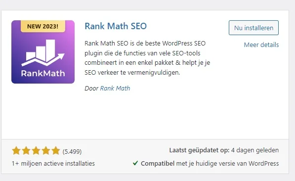 - Zoek naar ‘Rank Math SEO’ en klik op ‘Nu installeren’. In de onderstaande afbeelding zie je de juiste plugin