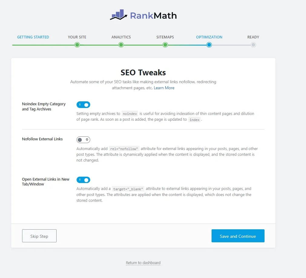 In dit tabblad veranderen we niets aan de instellingen. Sommige mensen vinden het fijn dat uitgaande links automatisch no-follow meekrijgen. Ik niet. Dit doe ik liever handmatig aangeven als ik het wil gebruiken. Je wil bijvoorbeeld voor adverteerders op je website juist wel do-follow links aanmaken. Als je per ongeluk vergeet de automatische no-follow uit te zetten, krijg je hier vast en zeker negatief commentaar op! Druk weer op Save and continue